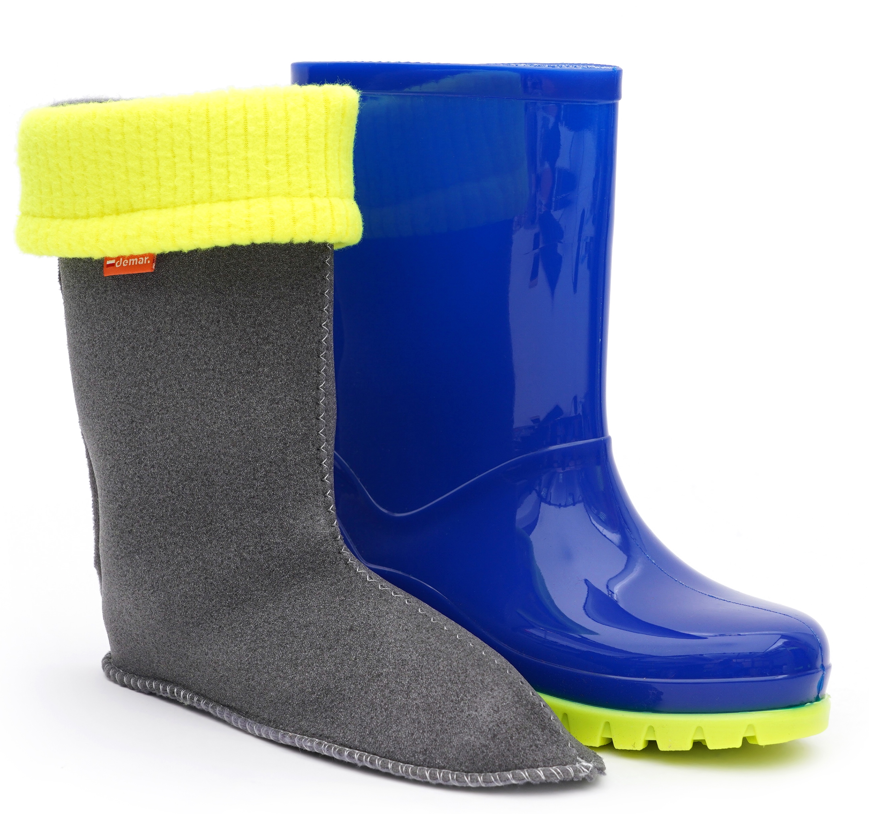 Детские резиновые сапоги Demar (Демар) имеют литую оболочку из ПВХ и съёмный утеплённый чулок из полиэстера, который согревает ногу. Может быть постиран при температуре 40 градусов. Если Вам не по душе синтетический материал, Вы легко можете вынуть чулок из сапога и использовать обычный шерстяной носок.